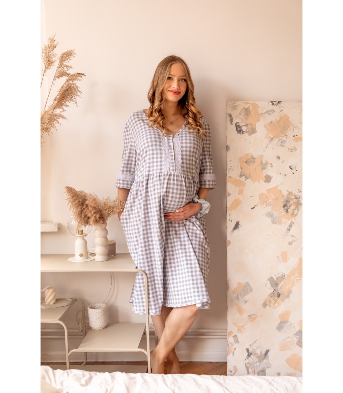Subtelna, bawełniana koszula ciążowa i do karmienia Lidia, została uszyta z przyjemnej oraz oddychającej dzianiny o składzie surowcowym - 100 % bawełna. Koszula jest w kolorze biało szarej kratki, przód oraz rękawki koszuli zdobi haftowana taśma. Koszula jest rozpinana z przodu na bezniklowe napki, dzięki czemu można łatwo karmić maluszka piersią, dodatkowo w dolnej części koszuli są boczne kieszenie.